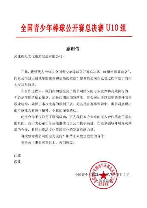 賽事組委會(huì)在感謝信中特別指出:“我們深切感受到了貴公司團(tuán)隊(duì)的專業(yè)素養(yǎng)和高效執(zhí)行力。無(wú)論是前期的精心策劃,還是后期的細(xì)致落實(shí),貴公司始終以高度的責(zé)任感和敬業(yè)精神,確保了本次比賽的順利開展。尤其是在賽事保障中,貴公司展現(xiàn)出的卓越能力和協(xié)作精神,令我們深受感動(dòng)。”